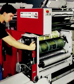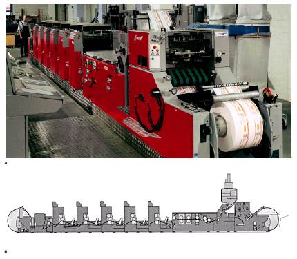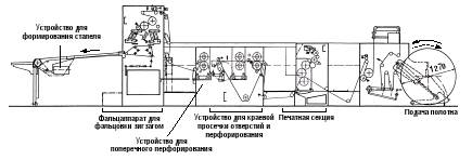 Рис. 5-16 Машина для печати бесконечных формуляров имеет одну или несколько устройств размотки, устройства ввода с выравниванием по боковой кромке на каждом полотне, несколько печатных секций, перфорационную станцию для круглых отверстий, продольный и поперечный перфораторы, пробивное устройство для получения отверстий для подшивки бумаг в регистратор, систему протяжки, фальцаппарат для фальцовки зигзагом, намоточное устройство и ещё возможную установку поперечной резки на листы на выводе (рис. 5-17). После печати формуляры могут объединяться с копировальной бумагой, чтобы получать в бюро копии (например, расчёты по зарплате в закрытом виде). После запечатки второй экземпляр может быть сохранен. Различают машины с постоянным и переменными форматами. Форматы, исторически сложившись, исчисляются в дюймах. Это связано и с интервалом между строками во всех пишущих машинках и компьютерных принтерах, который составляет 1/6’’. Поэ тому форматы формуляров также выражаются в дюймах. Даже немецкие форматы DIN имеют данные в метрической системе, приближённые к дюймовым. Миллиметровые бумаги печатаются на машинах для бесконечных формуляров со специальным приводом для метрических форматов. В машинах с постоянными форматами все агрегаты созданы под параметры определенного листа. Изготовление агрегатов для таких машин более дешево, чем для машин с переменными форматами. Машины, рассчитанные на один формат, используются, если в перспективе у типографии имеется достаточное количество заказов. Монотиражные табуляторные бланки изготавливаются выводом с рулона на фальцаппарат. Рис. 5-18 представляет в качестве примера такую установку. Рабочая ширина машины составляет от 800 до 1600 мм, скорость – от 450 до 600 м/мин. Табуляторные бланки печатаются, как правило, только в одну краску высокой непрямой печатью или офсетом. После печати бумажное полотно перфорируется по краям. Так называемое перфорирование Remaliner служит для проводки в принтер. Параллельно отверстиям по краю в нормированном отступе 1/2’’ наносится штриховая перфорация, чтобы позднее пробитый с отверстиями край легко можно было бы отделить от формуляра. Перед фальцовкой зигзагом полотно ещё раз перфорируется в поперечном направлении. Закаленные перфорационные ножи фиксируются в ротационном ножевом цилиндре. Полотно движется между перфорационным цилиндром и противоцилиндром. При конструировании устройств следует обращать внимание на подшипники и размеры перфорационного цилиндра. Они определяют скорость, с которой может работать машина без вибрации. Твердость противоцилиндра и перфорационных ножей согласовывается таким образом, чтобы износ касался в основном перфорационных ножей. В качестве фальцаппарата используется специальный фальцаппарат для складывания гармошкой. Вращающиеся спирали образуют фальц Leporello (" гармошкой"), облегчая формирование приемного стапеля потоком воздуха. Такие высокопроизводительные машины оснащаются прямым и обратным счёт ным устройством, приспособлениями для упаковки отдельных сфальцованных стапелей в картонные коробки и укладки их на поддоны с обтяжкой усадочной плёнкой. Автоматизация обеспечивает возможность контроля за работой нескольких печатных агрегатов одним оператором. Для обычной формулярной печати (шириной от 280 до 960 мм) сущ