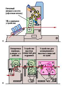 Рис. 5-17 При желании в печатные линии с изменяемым набором секций можно вставлять также флексографскую или трафаретную секцию. Кроме печатных секций должны переналаживаться и другие агрегаты, связанные с изменением формата. Речь идёт, например, об устройстве, обеспечивающем высечку отверстий для подшивки и перфорации. Фальцаппарат также настраивается на новую длину формата. Машины для печати бесконечных формуляров оснащаются дополнительными устройствами, которые позволяют настраивать их на получение многостраничного документа. Это необходимо, если различные предварительно запечатанные формулярные ленты подводятся к устройствам, где они должны вместе склеиваться или сшиваться. Различают рулонные и стапельные сортировальноподборочные устройства (коллаторы), которые обрабатывают формулярные комплекты из предварительно запечатанных рулонов или уложенного в стапель полотна, сфальцованного зигзагом (рис. 5-21). Если в формулярных комплектах должна быть предусмотрена порядковая нумерация, то коллаторы оснащаются так называемыми " сквозными нумерационными аппаратами". Нумерационная секция обеспечивает печать на всех частях формулярных комплектов (рис. 5-22).