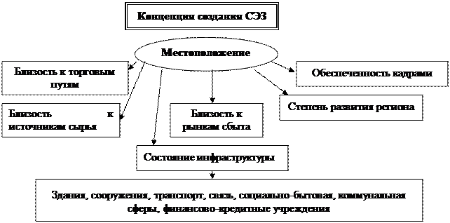 Рисунок 6.5 – Концепция создания свободных экономических зон Полезные сведения Свободные экономические зоны представляют собой часть национального экономического пространства, где используется особая система льгот и стимулов, не применяемая в остальных частях страны. Выделяют четыре основные группы льгот: 1.Внешнеторговые льготы. Они предусматривают введение особого таможенно-тарифного режима (снижение или отмену экспортно-импортных пошлин) и упрощенного порядка осуществления внешнеторговых операций. Ех: беспошлинный ввоз для нужд зоны сырья, материалов, оборудования, товаров народного потребления). 2. Налоговые льготы содержат нормы, связанные с налоговым стимулированием конкретных видов деятельности или поведения предпринимателей. Существует 2 вида налоговых льгот: 1) освобождение от уплаты налогов на определенный срок – «налоговые каникулы»; 2) снижение ставки налога. 3.Финансовые льготы включают различные формы субсидий. Они предоставляются в виде более низких цен на коммунальные услуги, снижения арендной платы за пользование земельными участками и производственными помещениями, льготных кредитов и др. 3. Административные льготы предоставляются администрацией зоны с целью упрощения процедур регистрации предприятий; право аренды, (в том числе, долгосрочной) земли, сооружений, зданий; упрощенный режим въезда-выезда иностранных рабочих и специалистов, а также оказания различных услуг. По статистическим данным Организации Объединенных Наций по промышленному развитию, на начало 2006 г. в 120 странах мира насчитывалось около 3 тыс. свободных экономических зон, в которых создавалось экспортной продукции на сумму около 600 млрд. долл. и обеспечивались рабочими местами до 50 млн. человек. В России создание СЭЗ началось в 1990 г. В декабре 1989 г. было принято постановление, где говорилось о создании двух СЭЗ – в Находке и Выборге. Режим особой экономической зоны применяется в Калининградской области с 1996 г. С 1 апреля 2006 г. вступил в силу новый закон «Об особой экономической зоне в Калининградской области...», который установил срок ее действия 25 лет и внес ряд существенных изменений в статус зоны. Решение о создании особой экономической зоны в Магаданской области было принято в 1999 г. 28 ноября 2005 г. состоялось заседание первых конкурсных комиссий по отбору заявок на создание особых экономических зон технико-внедренческого и промышленно-производственного типов. На конкурс поступили 72 заявки из 41 субъекта Федерации, из них на организацию и функционирование промышленно-производственных зон – 43 заявки. На основе результатов конкурса постановлениями Правительства РФ были созданы две промышленно-производственные (в Липецкой области и Татарстане) и четыре технико-внедренческие зоны (в Дубне, Зеленограде, Санкт-Петербурге, Томске). В 2006 г. в федеральном бюджете предусмотрено 8 млрд. руб. на строительство этих шести зон, аналогичный объем средств будет выделен из региональных и муниципальных бюджетов. Кроме того, в 2006 г. началась работа по формированию сети технико-внедренческих парков в Новосибирске, Тюмени, Казани, Сарове (Нижегородская область), Обнинске.