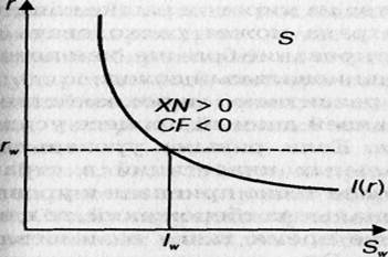 Рис. 6.1. Равновесие инвестиций и сбережений в малой открытой экономике В данном случае чистый экспорт положителен (NХ > 0), а счет движения капитала отрицателен (СF < 0). Если разница между инвестициями и сбережениями отрицательна, то страна испытывает потребность во ввозе капитала в объеме. Это определяет положительное значение чистого экспорта (NX > 0) и отрицательное — счета движения капитала (СF < 0). Таким образом, страна с отрицательным сальдо текущего счета, испытывая потребность в зарубежных инвестициях, предъявляет на них спрос. Страна с положительным сальдо текущего счета, или остальной мир, предоставляя эти средства данной стране, определяет предложение. Источником предложения капитала со стороны остального мира являются зарубежные сбережения. В действительности существование крупных развитых стран (третий случай) не может не оказывать воздействия на мировой рынок капиталов. Поэтому величина мировой процентной ставки в значительной степени будет определяться проводимой в таких странах экономической политикой. При этом чем больше средств привлекается из-за границы, тем более высокий процент приходится платить за их использование. И наоборот, чем выше ставка процента, тем привлекательнее становятся инвестирования, тем больше средств притекает из-за рубежа. Таким образом, предложение инвестиций на рынке данной страны будет прямо пропорционально изменению величины процентной ставки. Спрос на инвестиции (I) будет снижаться по мере увеличения процентной ставки (рис. 8.5). При этом равенство национальных инвестиций и сбережений не обязательно. Занимая средства на мировом рынке капиталов, страна может расходовать на инвестирование больше, чем позволяет национальный доход. С развитием мирохозяйственных связей данный процесс усиливается. Если раньше уровень национальных инвестиций в стране был более тесно привязан к уровню национальных сбережений, то в настоящее время такая взаимосвязь ослабла.