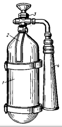 На горловине сосуда установлена насадка с отверстием (спрыск). Отверстие закрыто мембраной, которая предотвращает вытекание жидкости из огнетушителя. Она разрывается при давлении 0, 08-0, 14 МПа. В корпусе огнетушителя находится щелочная часть заряда - водный раствор двууглекислой соды с добавкой пенообразователя. Для приведения огнетушителя в действие поворачивают ручку запорного устройства на 180o, переворачивают огнетушитель вверх дном и направляют насадкой в очаг загорания. При повороте ручки открывается кислотный стакан и кислотная и щелочная части заряда смешиваются, в результате их взаимодействия образуется углекислый газ, который интенсивно перемешивает жидкость, образуя пену. Давление в корпусе огнетушителя повышается, и пена выбрасывается через насадку наружу. Для тушения различных веществ (кроме щелочных и щелочноземельных металлов) и электроустановок, находящихся под напряжением до 10 кВ, промышленность выпускает углекислотные огнетушители ОУ-2 (рис. 9.3.), ОУ-5, ОУ-8, ОУ-25, ОУ-80 и ОУ-400. Углекислый газ в баллонах огнетушителей находится под давлением 6... 15 МПа. Для приведения в действие огнетушителя его раструб направляют на очаг горения и нажимают курок затвора. При выходе из баллона газ, расширяясь, охлаждается и выходит в виде хлопьев.