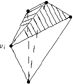 Пусть vi - промежуточная вершина многогранника, т. е. такая, что 2 £ i £ n - 1. Рассмотрим все ребра и грани, выходящие из нее вверх. Можно представить себе, что все они " веером" расходятся из vi (см. рис. 1, где веер состоит из трех ребер и двух заштрихованных граней). Для нас несущественно, сколько именно в таком веере ребер и граней; важно лишь, что для их чисел выполнено соотношение Pi = Гi = 1, i = 2, 3,..., n - 1. (3) Веер может состоять только из одного ребра; так будет, например, при i = n - 1. Именно здесь используется выпуклость многогранника: благодаря ей указанный веер будет только один. Если нет выпуклоскти, вееров может быть несколько, и тогда равенство (3) нарушается (см. рис. 2: два тетраэдра, приставленные друг к другу вдоль их общего ребра). Для самой верхней вершины vn нет ребер и граней, выходящих из нее вверх, поэтому Pn = Гn = 0. Общее число ребер многогранника равно P = P 1 + P 2 +... + Pn -1, а общее число его граней равно Г = Г 1 + Г 2 +... + Гn -1. Поэтому, используя равенства (2) и (3), получаем B - P + Г = n - (P 1 + P 2 +... + Pn - 1) + (Г 1 + Г 2 +... + Гn - 1) = n - (P 1 + P 2 +... + Pn - 1) + P 1 + (P 2 - 1) +... +(Pn - 1 - 1) = n - (P 1 + P 2 +... + Pn - 1) + (P 1 + P 2 +... + Pn - 1) - (n - 2) = 2.