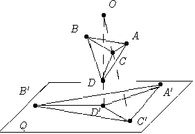 Второе доказательство. Пусть X - выпуклый многогранник и F - какая-либо его грань. Возьмем точку O, лежащую вне многогранника вблизи его грани F. Спроектируем многогранник с помощью центральной проекции из точки O на какую-нибудь плоскость Q, параллельную плоскости грани F. Тогда эта грань спроектируется на некоторый выпуклый многоугольник M, лежащий в Q, а проекции всех остальных граней многогранника X являются выпуклыми многоугольниками, которые образуют разбиение многоугольника M. На рис. 3 многогранник X есть тетраэдр ABCD, его проекция - треугольник A'B'C'. В случае многранника общего вида проекция изображена на рис. 4. При проектировании каждая вершина многогранника X переходит в вершину разбиения многоугольника M; при этом числа вершин у X и у разбиения M совпадают. Аналогично, числа ребер у X и у разбиения M одинаковы. С другой стороны, разбиение многоугольника M имеет на одну грань меньше, чем многогранник X. Сейчас мы понимаем под B, P и Г соответственно число вершин, ребер и граней разбиения M. Мы докажем, что B - P + Г = 1. откуда следует формула Эйлера (1).