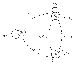 Проектировщик далеко не всегда может описать аналитически (или даже алгоритмически) поведение искомого автомата. Иногда проще указать «во что» перерабатывается та или иная последовательность входных букв. Полагая, что автомат имеет ограниченное число состояний, а также может быть установлен в начальное состояние, всю информацию «стимул—реакция» можно представить в виде дерева управления. Корнем дерева управления всегда является начальное состояние. Высота дерева h соответствует длине анализируемых вход – выходных последовательностей. Ветви 1-го яруса отображают реакции автомата на каждую из входных букв x 1, ……., x m, то есть на все слова длины 1. Ветви 2-го яруса — реакции автомата на все возможные слова длины 2 и т. д. По терминологии [1] рассматриваемое дерево представляет результаты многократного эксперимента над искомым автоматом. Так возникает задача свертки дерева с целью более компактного представления модели управления в виде конечного автомата. В общем случае некоторые ветви сформированного дерева управления могут оказаться неотмеченными, что соответствует получению частичного определенного автомата. Для однозначного восстановления автомата Мили с числом состояний не более n необходимо и достаточно иметь дерево управления высоты h Эта задача может быть решена путем отождествления неразличимых вершин, то есть таких вершин, из которых «растут» одинаково размеченные поддеревья. Причем высота сравниваемых поддеревьев определяется неразличимой вершиной, находящейся на верхнем (относительно других вершин) ярусе. Так, изображенное на рис. 1.1 дерево управления содержит три различимые вершины, соответствующие состояниям s 0, s 1, s 2 абстрактного автомата (рис. 1.2).
