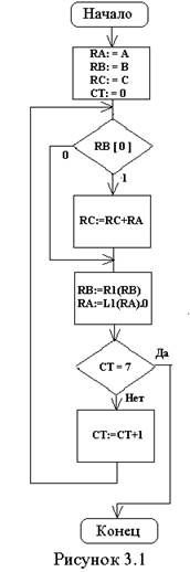 1. С = 0, СТ = 0 2. Если В[0] = 1, то С = С + А 3. А = L1(A). 0 – сдвиг числа А влево на 1 разряд (умножение на 2). 4. В = R1(В) – сдвиг числа В вправо на 1 разряд. 5. СТ = СТ + 1 6. Если СТ = 7 – перейти к пункту 8 7. Перейти к пункту 2 8. Операция выполнена