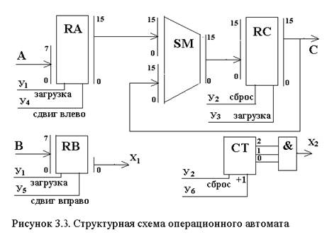 На структурной схеме ОА показаны описанные выше операционные элементы, связи между ними, указана разрядность данных и элементов. У операционных элементов – слева входы, справа – выходы, снизу показаны управляющие сигналы (микрокоманды У i), инициирующие выполнение определенной микрооперации этим элементом. На вертикальных линиях (на входах и выходах элементов) указаны разряды данных, поступающих на входы элементов и снимаемых с их выходов. Входами для ОА являются обрабатываемые данные (числа А и В) и управляющие сигналы (микрокоманды У i, формируемые управляющим автоматом). Выходы ОА – число С (результат выполнения операции умножения) и логические условия Х i (для управляющего автомата). Взаимодействие операционного и управляющего автоматов показано на рис.3.4.