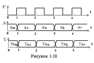 На рис.3.18 приведены временные диаграммы, поясняющие работу автомата Мура. Находясь в некотором состоянии a i автомат вырабатывает выходной сигнал (микрокоманду) yj, соответствующий этому состоянию. В это же время формируются сигналы управления элементами памяти D i, которые определяют следующее состояние автомата в зависимости от текущего и значений логических условий x i. При поступлении на вход синхронизации автомата положительного фронта импульса С, автомат переходит в новое состояние, определяемое значениями D i на входах триггеров Т2 Т1 Т0.