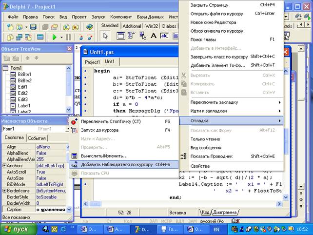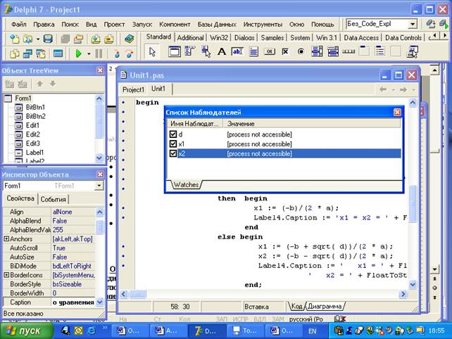 Мастер оценки выражений дает значения только отдельных переменных, а в сложных приложениях надо иметь значения нескольких переменных одновременно. Такую возможность предоставляет окно наблюдения Watches. Команда вызова: View | Debug Windows | Watches или из контекстного меню - ПКМ в окне Редактора Кода (см.рис 3 а и б.) Второй вариант: подвести курсор в коде к переменной и нажать Ctrl - F5. Окно наблюдения автоматически откроется и в нем появится имя переменной и ее значение. Можно выделить курсором какое-то выражение, нажать Ctrl - F5 и в окне наблюдения увидеть значение этого выражения. Если окно Watches уже открыто, то можно выделить в окне Редактора Кода интересующее выражение и перетащить его мышью в окно Watches. Особенности окна Watches: индикаторы около наблюдаемых величин (только в Delphi 7) позволяют отключать вывод в окно наблюдения соответствующего выражения во время выполнения приложения. Когда приложение остановлено, и надо посмотреть данное выражение в окне наблюдения, можно включить индикатор и увидеть значение наблюдаемой величины.