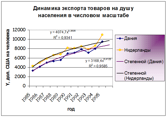 особенности развития двух стран в период с 1985 по 1995 гг. ü Рассмотрев динамику экспорта на душу населения в обеих странах, можно сделать выводы: ü В целом в Дании и Голландии наблюдаются почти одинаковые динамики изменения экспорта на душу населения: - падающий рост до 1989 г. - относительный спад в 1989 г. - скачок темпов роста в 1990 г. - спад до критического значения в 1993 г. - возрастающий рост после критического спада ü Оба тренда имеют степенной вид, и близкое к 1 значение коэффициента детерминации позволяет сделать прогноз на 1 период вперед. ü Приближение кривых в своем течении к прямым позволяет говорить о стабильном росте экспорта товаров на душу населения в обеих странах. ü Экспорт товаров на душу населения в Голландии на порядок выше экспорта товаров на душу населения в Дании, за счет этого абсолютное значение 1% прироста в Голландии оказывается выше, чем в Дании. ü Темпы роста отличаются не сильно, т.е. относительно своих параметров страны развиваются относительно одинаково. ü Однако базисные темпы прироста Дании выше, чем в Голландии, что позволяет сделать прогноз о возможности того, что Дания в скором времени догонит Голландию по экспорту на душу населения.