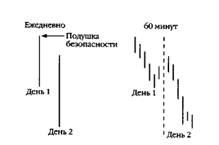 Я вожу машину уже более 45 лет, но ни разу не был в аварии, вызванной собственной неосторожностью. Из этого факта вы можете сделать вывод, что я отношусь к разряду очень осторожных водителей или, по крайней мере, был осторожным водителем, и поэтому особой потребности в защите мне лично на дороге не нужно. В течение тех же самых 45 лет, меня дважды выкидывало через ветровое стекло при столкновениях " лоб в лоб". В обоих случаях я сидел правильно - на правом пассажирском месте, а водитель рядом со мной вел машину по своей полосе со скоростью, которая была более низкая, чем предельная на данном участке. Оба несчастных случая были вызваны пьяными водителями других машин, выскакивающими с огромной скоростью на встречную полосу. Основываясь на полученном опыте, я никогда не рассматриваю покупку автомобиля, который не имеет двух подушек безопасности: для водителя и пассажира на переднем сидении. Рассматривая мой автомобильный опыт статистически, можно определить, что я нуждаюсь в по- душке безопасности, скорее, не от самого себя, а для защиты от пьяных водителей. Иногда рынок действует подобно пьяному водителю, поэтому вы нуждаетесь в защищающей подушке безопасности. Как дополнительное свидетельство потребности в подушке безопасности от рынка: мы знаем, что трейдеры, которые ушли с рынка не потому, что они не могли торговать с выгодой; обычно они уходили из-за нескольких больших потерь, чем вследствие многих маленьких неудач. Если вы будете тщательно защищать свою торговлю, то сможете выдержать длинную череду маленьких потерь и не прекратить торговлю. Мы нуждаемся в подушке безопасности, чтобы защитить себя от больших потерь. К счастью, рынок дает нам превосходную технику для установки уровня убытков, сохраняющих жизнь и торговлю. Рынок может быть разбит на пять различных временных структур, которые подобны между собой и активно взаимодействуют друг с другом. Мы начинаем с выделенного интервала (кванта) времени, протяженностью месяц: Каждый месяц содержит 4.3 недели; каждая рабочая неделя содержит 5 дней; каждый день содержит 5-6 торговых часов; каждый торговый час содержит 4 (15 -минутных) или 6 (10-минутных) баров. Каждый выделенный интервал времени составляет приблизительно одну пятую часть каждого временного периода более высокого порядка и, в то же самое время, включает в себя примерно пять временных периодов одним порядком ниже. Мы размещаем подушку безопасности на одно минимальное отклонение цены или тика, выше/ниже, чем самое высокое/низкое значение второго бара назад от рассматриваемого, взятого из временного периода более высокого уровня (или добавочного одного бара назад, который имеет одновременно наивысший пик и наивысшее дно или наименьший пик и наименьшее дно, по сравнению с рассматриваемым баром), (см. Рисунок 6-9.) Это - наша подушка безопасности. Ее цель состоит в том, чтобы защитить нас против " пьяного" рынка, который двигается против нас. Помните, это не обязательно сигнал для входа, это - защита от больших потерь. Если ваша подушка безопасности размещена высоко, то тем самым она говорит вам, то, что вы не желаете находиться в короткой позиции, если рынок достигнет установленного ею значения. Если ваша подушка безопасности находится низко, то тем самым она вам сообщает, что вы не хотите находиться в длинной позиции, если рынок и