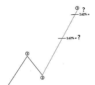 Рис. 7-5 Характеристики волны 3 жение сопровождается небольшим объемом, то это - как правило, взрыв, вспышка (продажа " по любой цене"). Во время волны 3 экономические обстоятельства обеспечивают поддержку движению, что не является верным во время волны 1. Причины фундаментального характера начинают накладываться на технические индикаторы. Здесь - самые и наиболее выгодные периоды, чтобы быть на рынке и обязательно " полностью загрузить вагон" во время существования таких волн. Лучшими, первоначально определяемыми, целями для длины волны 3 являются те, которые попадают в диапазон цен, определенных через 1 и 1.62 кратное увеличение расстояния волны 1. Крайне редко волна 3 бывает короче волны 1. Гораздо чаще она бывает длиннее в 1.62 раза длины волны 1. Наилучший путь точно прицелиться на конец волны 3 - перейти к меньшему временному интервалу и использовать скопление пяти волшебных пуль, чтобы найти конец пятой волны (полного пяти волнового движения, поглощаемого, и определяемого одной волной три более высокого уровня), входящей в волну 3. Вот они - эти " волшебные пули": 1. Дивергенция на нашем MFI осцилляторе; 2. Размещение внутри целевой зоны; 3. Формирование фрактала на вершине (внизу); 4. Один из трех наивысших (низших) баров - " приседающий"; 5. Изменения в направлении моментума в индикаторе Profitunity схождение/расхождение скользящих средних (MACD).