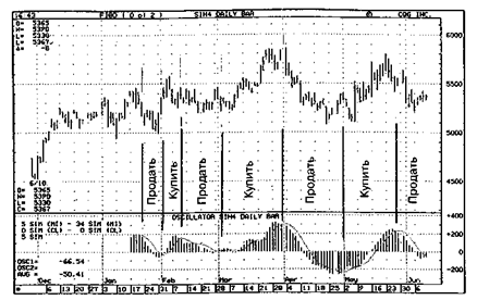 Рис. 7-23 Немедленное определение движущей силы рынка среднее), а затем нам нужно будет брать торговлю только в сторону текущего моментума (Рисунок 7-23). Эта техника - наиболее чувствительный и точный фильтр для определения изменения текущей движущей силы (моментума). Если гистограмма расположена ниже сигнальной линии, то мы встаем только в короткие позиции. Если гистограмм - выше сигнальной линии, то мы занимаем длинные позиции. Мы должны рассмотреть еще одну маленькую деталь, чтобы увеличить нашу точность в подсчете волн. Когда пропорция баров (100-140) корректна, то мы видим дивергенцию, которая не возвращается назад к нулевой линии, как это видели раньше на пике волны 3 меньшего порядка внутри большой волны 3. MACD будет двигаться в обратном направлении (но не к нулю), а затем возвращаться снова назад и генерировать дивергенцию, сообщая нам, что это - волна 5 из большой волны 3, а потому пик большей волны 3 находится в этой точке. И снова, наиболее общая ошибка, которую делают последователи Эллиота, принимая пик волны 5 внутри большой волны 3 за конец большой волны 5. Основываясь на этой ошибке, они занимают новые позиции в противоположном направлении и бывают убиты позже, как только развивается реальная волна 5 и останавливает затем их. После завершения волны 5 внутри большей волны 3 MACD возвращается к нулевой линии, определяя, что минимальные требования к волне 4 выполнены. Волна 4 часто заканчивается около завершения волны 4 внутри большой волны 3. Если эта точка вблизи обычного корректирующего соотношения Фибоначчи, то это обеспечивает больше доверия к этой цели. С навыком работы с этим MACD, вы можете в своей торговле отбросить ваши стохастические осцилляторы, RSI, индикаторы моментума, а также все прочие, родственные им инструменты. Никакой из них не приближается даже близко к той точности, которую демонстрирует этот MACD. Один только этот индикатор может принести неоценимую помощь любому серьезному трейдеру. Модели дивергенции происходят каждый день по много раз на каждом фьючерсном контракте. Это бесценно как для внутри дневной, так и долгосрочной позиционной торговли. В Главе 10 мы сведем все вместе в единую простую форму (Profitunity Торговый Партнер). Это будет все то, что мы уже обсудили к настоящему времени, а также прибавится еще два индикатора.