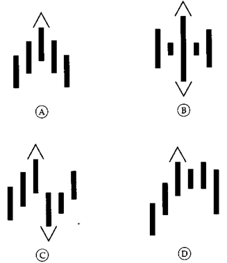 Рисунок 8-1 Примеры инициирующих фракталов Заметьте, как на Рисунке 8-1 модель " А" показывает чистый фрактал, где два предыдущих и два последующих баров имеют более низкие вершины, чем средний бар. Он устанавливается как фрактал наверх4, обозначаемый значком (L). Модель " В" также является фракталом наверх, но в то же самое время, создает фрактал вниз5 (v). Это происходит из-за того, что два предыдущих бара и два последующих бара представляют собой " внутренние" бары. Они выполняют требование, согласно которому средний бар должен иметь самую высокую вершину или наименьшее основание из минимальной последовательности пяти баров. Модель " С" образует другую формацию, которая создает одновременно оба фрактала: как фрактал наверх, так и фрактал вниз. Как показано, эти фракталы имеют возможность " делить" бары. Модель " D" требует шести баров, чтобы оформился фрактал, потому что вершина пятого бара почти равна предшествующей вершине. Помните рабочее определение: