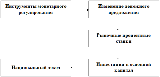 Понятие трансмиссионного механизма впервые появилось в кейнсианском анализе. Трансмиссионным (передаточным) механизмом Дж. М. Кейнс назвал систему переменных, через которую предложение денег влияет на экономическую активность [3]. Кейнс считал, что денежно-кредитное регулирование, изменение объема денежного предложения оказывают влияние на воспроизводство только путем воздействия на инвестиционный процесс, и только в том случае, если оно способно изменить психологическую ситуацию на денежном рынке, снизив норму процента. Поэтому модель трансмиссионного механизма Дж. М. Кейнса работает следующим образом (схема 1). Трансмиссионный механизм по Дж. М. Кейнсу