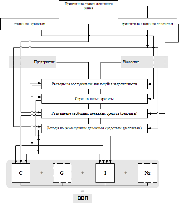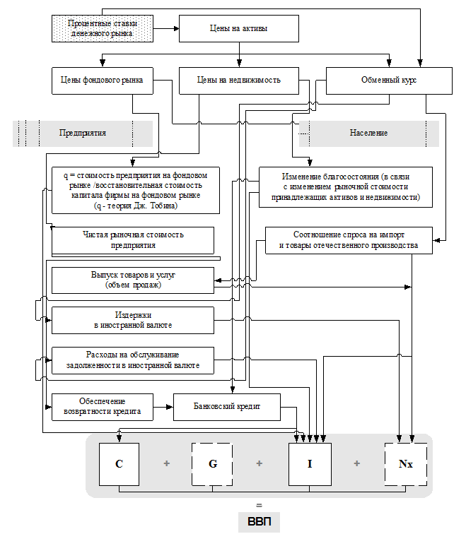В результате изменения реального (скорректированного на уровень инфляции) денежного предложения происходит изменение рыночной ставки процента по кредитам. При увеличении денежного предложения рыночные ставки на денежном рынке снижаются, при сжатии – растут, приводя, в свою очередь, к изменению инвестиционных расходов. Данная зависимость предполагается убывающей, т. е. чем ниже при прочих равных условиях рыночные процентные ставки (стоимость долгосрочного кредита), тем больший объем инвестиций в основной капитал могут осуществить предприятия. В свою очередь, инвестиции связаны положительной зависимостью с динамикой совокупного национального дохода. Несмотря на то, что первоначально Дж. М. Кейнс рассматривал работу трансмисионного механизма через инвестиционную политику предприятий, позже исследователи показали, что аналогичным образом этот же механизм работает и через решения потребителей относительно приобретения товаров и услуг длительного пользования, а также недвижимости. Рассмотрение не только процентной ставки, но и цен на другие активы при анализе трансмиссионного механизма монетарной политики впервые предложено М. Фридманом. Впоследствии эти подходы развивались в моделях Ф. Модильяни, У. Баумоля, Дж. Тобина и других исследователей. В современном понимании трансмиссионный механизм в широком смысле – это совокупность каналов, по которым монетарные импульсы, генерируемые центральным банком, воздействуют на основные макроэкономические переменные (ВВП, занятость, инфляцию), характеризующие основополагающие цели экономической политики государства. При этом в экономической литературе нет единого мнения относительно количества и классификации каналов воздействия монетарной политики на реальный сектор экономики. Наиболее распространенным является выделение процентного канала, канала передачи монетарных импульсов через цены на активы (к которым относят, как правило, цены фондового рынка, цены на недвижимость, обменный курс), кредитного канала. Иногда воздействие изменений в монетарной политике на экономику через обменный курс выделяют в отдельный канал трансмиссионного механизма. Многие авторы наряду с процентный каналом, каналом цен на активы (включая обменный курс) и кредитным каналом выделяют «денежный канал», «канал благосостояния», «балансовый канал» [например, 1; 4; 5 и др.]. Отождествление понятий «канал трансмиссионного механизма», «взгляд на трансмиссионный механизм» (или подход к его анализу) и «эффект, связанный с воздействием монетарной политики» приводит к неоднозначности трактовок, путанице понятий и осложняет анализ трансмиссионного механизма монетарной политики. В целом, любое деление механизма воздействия монетарной политики на экономику на каналы условно. Экономическая действительность исключительно сложна, в особенности в условиях переходной экономики. Поэтому попытка выделить определенные каналы воздействия изменений в политике центрального банка на экономику является упрощением реальной ситуации, обусловленным необходимостью абстрагироваться от слишком большого количества условий, влияющих на взаимосвязи денежно-кредитных и макроэкономических переменных. Кроме того, необходимо отметить, что попытки анализа трансмиссионного механизма «вообще», без учета особ