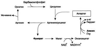 Рис. 9-17. Цикл регенерации аспартата, сопряжённый с орнитиновым циклом. АТФ на каждый оборот цикла. Однако процесс превращения аминокислот в безазотистые остатки и мочевину имеет пути компенсации энергозатрат: