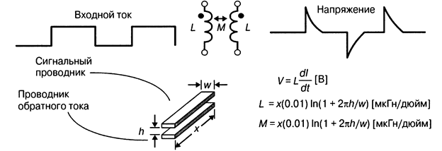Взаимная индуктивность образуется на ПП подобно конденсатору. Она появляется в результате размещения двух дорожек одна над другой в соседних слоях или же при размещении их рядом в одном слое (рис. ПБ9). Для обеих конфигураций изменение тока во времени Для исключения влияния шума потенциальных источников электромагнитных помех лучше всего разнести бесшумные аналоговые линии и создающие шум порты ввода/вывода, использовать низкоомные шины питания и земли, минимизировать индуктивности цепей цифровых сигналов и ёмкостные связи в аналоговых схемах.