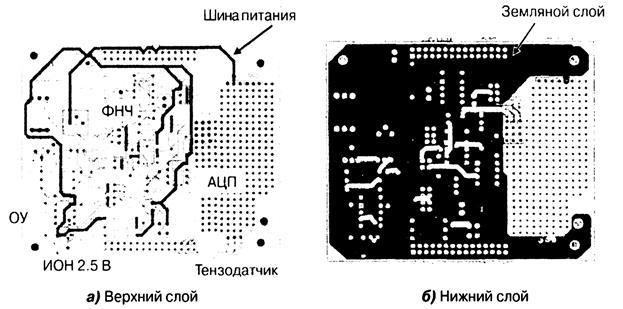 Земляной слой (рис. ПБ20, б) имеет несколько разрывов из-за сигнальных дорожек – их количество должно быть минимальным. Дорожки обратных токов не должны быть слишком узкими, чтобы не оказывать сопротивление току, протекающему от устройства к разъему питания. Наличие слоя питания в 12-битной системене так важно по сравнению с необходимостью земляного слоя. Хотя наличие слоя питания позволяет решить некоторые проблемы: увеличение ширины дорожек цепей питания на плате в два или три раза, а также установка развязывающих конденсаторов позволяют успешно бороться с шумами источника питания.