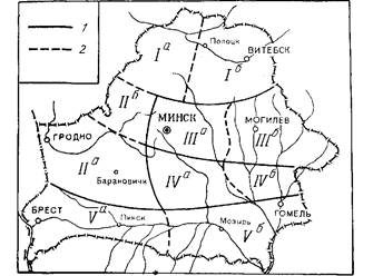 Рис. Интродукционные районы на территории Беларуси: I – Северный, II – Западный, III – Северо-центральный, IV – Южно-центральный, V – Южный; а, б – подрайоны; 1 – границы районов; 2 – границы подрайонов Северный, или Браславо-Полоцко-Витебский, район. На западе граничит с Литвой, на севере – с Псковской, на востоке – со Смоленской областями. В состав северного района входят Мядельский район Минской области и все районы Витебской области. В климатическом отношении этот район выделяется как самый холодный из всех интродукционных районов Беларуси, так как занимает северную часть республики. На территории района преобладают дерново-подзолистые суглинистые почвы. Район характеризуется обилием озер; имеются болота, среди которых преобладают сфагновые. Район можно подразделить на два подрайона: западный, более теплый, и восточный, более холодный. Западный, или Гродненско-Молодечненско-Барановичский район занимает северо-западную часть республики. В районе расположены Ошмянская гряда, Гродненская, Волковысская, Слонимская и Новогрудская возвышенности, а также западная часть Минской. Западный район значительно отличается от северного по абсолютным минимальной и максимальной температурам воздуха, по времени последних заморозков весной и количеству годовых осадков, а также количеством дней в году со снеговым покровом. Разница в количестве дней в году со снеговым покровом между восточной частью северного района и восточной частью западного равна 40 дням. Северная часть западного района по ряду показателей резко отличается от южной его части. В районе преобладают дерново-подзолистые суглинистые и валунно-супесчаные почвы. Распространены также песчаные слабооподзоленные. Большинство произрастающих в районе видов менее зимостойки по сравнению с видами северного района. Западный район подразделяется на два подрайона: юго-западный с более теплым и северо-восточный с более холодным климатом. Северно-Центральный, или Минско-Могилевско-Кричевский район занимает северо-центральную часть республики. В районе расположены водораздельные Минская возвышенность и Оршанско-Могилевское плато. Территория характеризуется расчлененным рельефом и расположена на высоте 200–300 м над уровнем Балтийского моря. В районе имеются болота, в западной части их больше, чем в восточной. По ряду климатических показателей район выделяется среди западного и северного, Северо-восточная часть северно-центрального района отличается от юго-западной количеством дней в году со снеговым покровом: в первой части снег лежит па 20 дней больше, чем во второй. В районе преобладают дерново-подзолистые, пылевато-суглинистые, безвалунные и валунно-супесчаные почвы. Наиболее богатыми по видовому составу древесных растений являются парк в Лошице (возле г. Минска), Центральный ботанический сад. Экзоты имеются также в Борисове, Дзержинске, Минске, Могилеве, в парке Белорусской сельскохозяйственной академии (г. Горки), а также в культурах в Горецком лесхозе и в Прилукской даче (Минская область). Северно-центральный район можно разделить на два подрайона: западный, более теплый, и восточный, более холодный. Южно-Центральный, или Слуцко-Бобруйско-Чечерский район занимает южно-центральную часть республики. Территория района имеет равнинный характер. В западной части болот бол