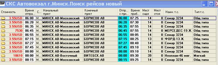 Программа автоматически сама выберет список рейсов, удовлетворяющих заданным условиям. Отображаются неотправленные рейсы, на которые все билеты проданы, в меню не отображаются. После нажатия «Enter», система выберет все рейсы, удовлетворяющие условиям, и выведет в виде таблицы. Количество выводимых рейсов в одном экране 11. Если не все рейсы отображаются на одном экране, то справа появляются прокрутка. Бегунок показывает положение, относительно всего списка. Смена выводимых экранов, осуществляется при помощи PgUp и PgDn.