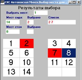 Нажатие Enter на данной кнопке приведет к автоматическому выбору свободных мест и формированию билетов. Если необходимо провести ручной выбор мест, то по клавише «→» переходим к кнопке «Выбрать места» и нажимаем Enter. На экране появляется окно выбора мест, в котором схематично представлены номера свободных мест. Перемещаясь по свободным местам (белые квадраты) отмечаем места для билетов нажатием клавиши «Пробел» или щелчком левой кнопки мыши. Данная форма не контролирует количество отобранных билетов (поле «Выбрано») с количеством запрошенных билетов (поле «Выбрать места»).