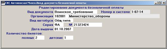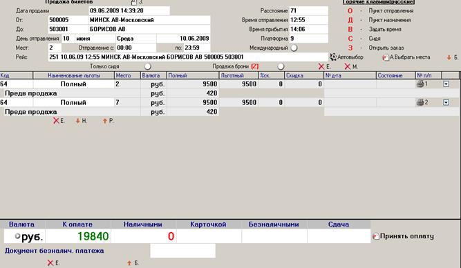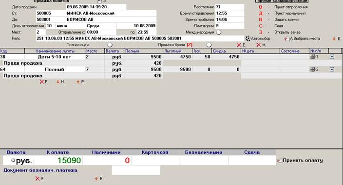 Отказ от выбора конкретного места осуществляется его повторным выбором. Нажатие клавиши «Esc» отменяет весь выбор. После выбора мест, по нажатию клавиши «Enter», формируются билеты. С этого момента выбранные места резервируются для продажи. Форма продажи билета иметь вид представленный ниже: