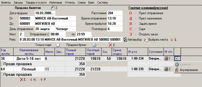 После нажатия клавиши с русской буквой «П» или щелчка левой клавишей мышки по иконке с изображением принтера происходит вызов программы выполняющей операцию регистрации продажи и печати билета. В случае успешного выполнения операции в поле «Состояние» отображается текст «Оформлен». В случае неуспешного завершения операции документ остается в состоянии «Не распечатан». После устранения причины ошибочного завершения операции происходит опрос КСА для уточнения состояния документа и в зависимости от этого происходит выбор продолжения обработки документа. Возможен случай, когда состояние билета перешло в «Оформлен», но билет испорчен. Тогда на вопрос