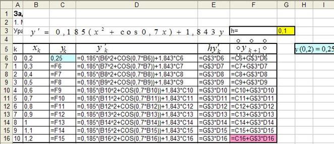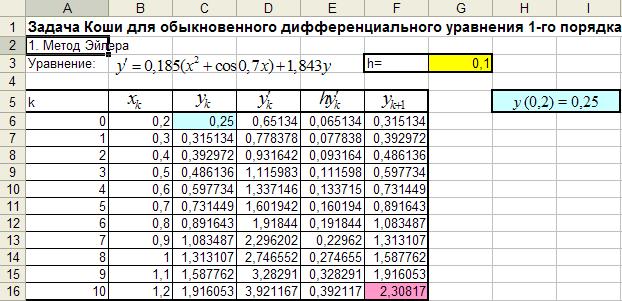 Погрешность вычислений на каждом шаге составляет Пример. Решить задачу Коши для обыкновенного дифференциального уравнения 1-го порядка методом Эйлера. Вычисления выполнять с четырьмя десятичными знаками на отрезке [0, 2; 1, 2] с шагом 0, 1. Уравнение: