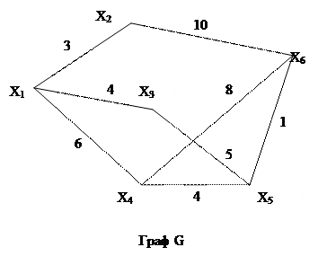 Требуется определить кратчайший путь из вершины Х1 до вершины Х6. Применим алгоритм Дейкстры. Шаг 1. 1. Для Х1 постоянная метка l*(X1) = 0. Для остальных вершин временные метки l(Xi) = ∞, i = 2, 3, 4, 5, 6. 2. Г(X1) = {X2, X3, X4}. Новые временные метки: L(Xj) = min{l(Xj), l*(Xпред.) + rпред., j}. Тогда L(X2) = min{ ∞, 0 + 3} = 3; L(X3) = min{ ∞, 0 + 4} = 4; L(X4) = min{ ∞, 0 + 6} = 6. Наименьшая из всех временных меток: 3. Min{L(X2), L(X3), L(X4), L(X5), L(X6)} = min{3, 4, 4, ∞, ∞ } = 3. Следовательно, получаем постоянную метку для вершины Х2: l*(X2) = 3. Шаг 2. 1. Г(X2) = {X6}; 2. L(X6) = min{ ∞, 3 + 10} = 13; 3. Min{L(X3), L(X4), L(X5), L(X6)} = min{4, 6, ∞, 13} =4. → l*(X3) = 4. Шаг3. 1. Г(X3) = {X5}; 2. L(X5) =min {∞, 4 + 5} =9; 3. Min{L(X4), L(X5), L(X6)} = min{6, 9, 13} = 6. → l*(X4) = 6. Шаг 4. 1. Г(X4) = {X5, X6}; 2. L(X5) = min {9, 6 + 4} = 9; L(X6) = min {13, 6 + 8} = 13; (остались теми же); 3. Min {L(X5), L(X6)} = min {9, 13} = 9. → l*(X5) = 9. Шаг 5. 1. Г(X5) = {X6}; 2. L(X6) = min {13, 9 + 1} = 10. → → l*(X6) = 10. На этом процесс расстановки меток закончен. Значение постоянной метки вершины Х6 даёт кратчайшее расстояние между Х1 и Х6, которое равно 10. Кратчайший путь между Х1 и Х6 определяется с помощью соотношения l*(Xj) =l*(Xi) + rij, в котором вершина i предшествует j, тогда можем найти вершину, предшествующую Х6: l*(X6) = l*(Xпредш.) + rпредш. 6. На графе видим, что Х6 предшествуют Х2, Х4 и Х5. Составим следующую таблицу: