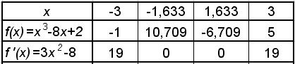 f (-3)∙ f (3) < 0, поэтому на отрезке [-3, 3] имеется или один корень, или нечетное число корней. f' (x) = 3 x 2 - 8 – непрерывна. Для определения интервалов монотонности f (x) найдем значения x, при которых f' (x) = 0. f' (x) = 3 x 2 – 8 = 0 при x = Таким образом, можно отделить следующие интервалы монотонности функции f (x): [-3; -1, 633], [-1, 633; 1, 633], [1, 633; 3] и на каждом из этих интервалов отделено по одному корню уравнения. Для наглядности вычислим значения f (x) и f' (x) на концах этих промежутков (табл. 1). f' (x) = 3 x 2 – 8. Таблица 1