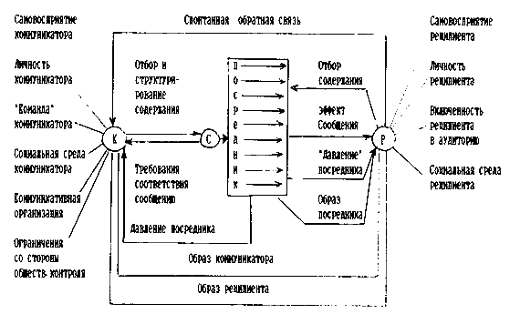 Рис. 4.3. Циркулярная модель коммуникации: К – коммуникатор; С – сообщение; Р – реципиент. В модели Малецке большое значение придается принципу детерминизма: уникальное сочетание факторов, сложившееся в данный момент в звене коммуникатора, порождает четко (ими) заданное коммуникативное поведение, которое накладывается на ситуацию в звене получателя и влечет закономерные, предсказуемые последствия. Предсказуемость - ценнейшее качество модели, позволяющее прогнозировать исход коммуникативной ситуации и управлять ею. Единицы анализа коммуникации. Рассмотрим основные понятия и термины, используемые для анализа коммуникативного процесса и его элементов. Источник сообщения. Коммуникатор – создатель сообщения. Источником может быть лицо, организация, группа лиц или индивид, передающие это сообщение. Коды – символы или знаки, переводящие сообщение на язык, понятный получателю. В качестве кодов используются вербальные и невербальные средства коммуникации. Кодирование ставит задачу преобразования сигнала в форму, обеспечивающую оптимальную передачу сигнала по определенному каналу коммуникации. Передаваемая информация должна адекватно восприниматься получателем. Для этого кодирование и декодирование замыкается в единую цепь. Сообщение – информация или закодированная идея, т.е. то, что передает источник получателю. Сообщения состоят из знаков различного рода (вербальных и невербальных). Средство и канал коммуникации. Данные термины используются для определения различия между типом используемого кодирования (средство) и маршрутом, по которому сообщение направляется (канал). Обычно каналы делятся на технические (СМИ) и межличностные. Коммуникант (адресат, получатель) – лицо, или группа лиц, массовая аудитория, которым направлено сообщение. Получатель информации должен уметь: быстро выделить тематику информации по ключевым словам; правильно интерпретировать начало сообщения и, следовательно, предвосхищать его развертывание; восстановить смысл сообщения, несмотря на пропущенные элементы; правильно определить замысел высказывания. Эти умения соотносятся с системой кодирования-декодирования, обеспечивающей коммуникацию. Барьеры коммуникации — помехи, мешающие осуществлению контактов и взаимодействию между коммуникатором и реципиентом. Они препятствуют адекватному приему, пониманию и усвоению сообщений в процессе осуществления коммуникативных связей. Барьеры коммуникации можно классифицировать по характеру действующих помех. Технические помехи. Источником таких помех является сам канал коммуникации (факс, телефон) и его технические неисправности. Психологические помехи связаны с отношениями между коммуникатором и реципиентом, их установками к каналу информации, способам, содержанию и форме сообщения. Психофизиологические помехи возникают из-за сенсорных способностей, особенностей человеческого восприятия, способности человеческого мозга к запоминанию и переработке информации. Языковые помехи возникают на фонетическом и семантическом уровне. На фонетическом - из-за неразличимости звуков, плохого произношения, неприятия темпа речи, а на семантическом — по причине непонимания обозначенного смысла. Социальные помехи выражены в принадлежности коммуникантов к разным социальным группам, они обусловл