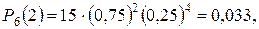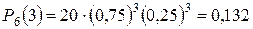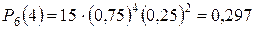 Можно показать, что для случайной величины Х, распределенной по биномиальному закону, математическое ожидание равно произведению параметров Пример 4.2.1. Проверкой качества установлено, что из каждых 100 деталей не имеют дефектов 75 штук в среднем. Составить биномиальное распределение вероятностей числа пригодных деталей из взятых наугад 6 деталей. Из условия задачи следует, что По формуле Бернулли