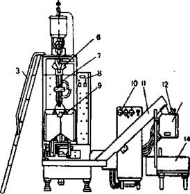 1-поршневой дозатор; 2-бак молочный; 3-лестница; 4-рулонодержатель; 5-отвод готовой продукции; 6-рулонообразователь; 7-механизм сварки продольного шва; 8 и 10-шкафы электрооборудования; 9-механизм сварки поперечного шва; 11-транспортер пакетов; 12-фотоэлемент счетного устройства; 13-бункер; 14-транспортер ящиков с пакетами Рис. 2. Общий вид автомата для розлива молока в полиэтиленовые пакеты Технологическая схема автомата для розлива молока показана на рис 3. Он состоит из рулонодержателя, на котором находится рулон пленки 1, тормозного устройства для выравнивания и натяжения ленты пленки, направляющих валиков 2, механизма печатания даты 3, рукавообразователя 7, механизма продольной сварки 8, поршневого дозатора 5с дозировочной трубой 9, механизма поперечной сварки 10 и обрезки пакета 11. Перед рукавообразователем установлена бактерицидная лампа 4для стерилизации поверхности пленки.