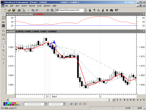 Рис 2.5 Сигналы покупки и продажи при использовании 2 средних.