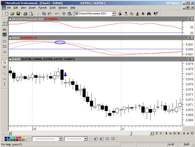 Я рекомендую использовать этот индикатор следующим образом: Определить, что сейчас тренд (как уже говорилось ранее при помощи ADX). После этого есть следующие варианты сигналов: 1) Разворот гистограммы (которая представляет из себя разницу 12 и 26 ЕМА - некоторые трейдеры используют просто линию иного цвета, нежели сигнальную) - это первый сигнал к покупке или продаже (разворот снизу вверх ниже нулевого уровня) 2) Разворот сигнальной линии – более надежный сигнал, но часть прибыли будет упущена, а соотношение лосс/профит возможно несколько ухудшится. 3) Третий вариант – пересечение сигнальной линии и гистограммы – используем вход по направлению гистограммы. 4) Самый сильный сигнал – дивергенция на MACD и на графике – бывает не так часто. Встаем по направлению вектора на индикаторе (то есть, например, если на индикаторе “впадины” идут наверх, а на графике вниз – встаем наверх, то есть покупаем). При этом стоп-лоссы ставим, как указано ранее, а прибыли можно либо снимать при достижении цели либо при обратном развороте гистограммы на MACD. Фильтром для входа служат свечи.