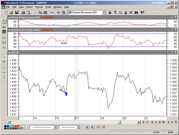 Рис. 2.9. Вход в рынок на дивергенции по RSI