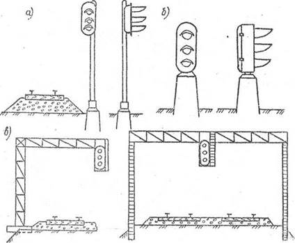 Для улучшения видимости светофора на кривых участках пути линзовые комплекты дополняются бесцветным рассеивателем, позволяющим рассеивать поток света в горизонтальной плоскости. Применение ступенчатых линз уменьшает потери световой энергии в стекле, а также облегчает и удешевляет линзы. Входные или маршрутные светофоры станций с пологими стрелками дополняются зелеными светящимися полосами. Прожекторные светофоры применяются на участках с полуавтоматической блокировкой и отличаются от линзовых тем, что светофорная головка сигнала имеет один оптический прибор (сигнальный механизм), способный подавать несколько сигнальных показаний (красный, зеленый, желтый цвета). Смена сигнала происходит путем перемещения перед источником света рамки со светофильтрами сигнальных цветов. Прожекторные светофоры могут иметь одну или несколько (одна под другой) светофорных головок, расположенных на мачте и смещенных относительно оси мачты в сторону пути.