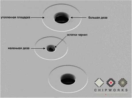 Рис.1 — Вид капелек краски на бумаге под микроскопом Главным узлом струйного принтера является печатающая головка (около 80% от стоимости принтера), которая собственно и наноситкапельки краски на бумагу. Краска наносится через маленькие отверстия называемые дюзами. Полный диаметр одной дюзы составляет порядка от трех (при разрешении 4800 dpi) до нескольких десятков микрон. Увеличенный вид дюзы представлен на рисунке два.