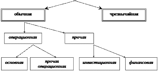 Основная деятельность связана с производством или реализацией продукции, товаров, является главной целью создания предприятия и обеспечивает основную часть его дохода. Инвестиционная деятельность – это совокупность операций по приобретению и списанию необоротных активов, которая приводит к изменению структуры актива баланса. Финансовая деятельность приводит к изменениям размера и состава собственного и заемного капитала. Чрезвычайная деятельность связана с событиями или операциями, которые отличаются от обычной деятельности и не ожидается, что они будут повторяться периодически или в каждом предстоящем отчетном периоде. Расходы, возникающие на предприятии, делятся следующим образом, исходя из видов деятельности:
