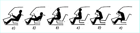 На рис. 1 показан механизм образования травм при встречных столкновениях у водителя легкового автомобиля. В начале удара водитель скользит по сиденью вперед, и его колени ударяются о панель приборов (рис. 1, а и б). Затем сгибаются тазобедренные суставы, и верхняя часть туловища наклоняется вперед до удара о рулевое колесо (в и г). При больших скоростях автомобиля возможен удар о ветровое стекло (д и е), а при боковых столкновениях – повреждение головы об угловую сторону кузова.