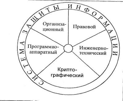 Рис. 2. Элементы системы защиты информации 2. Организационный элемент системы защиты информации содержит меры управленческого, ограничительного (режимного) и технологического характера, определяющие основы и содержание системы защиты, побуждающие персонал соблюдать правила защиты конфиденциальной информации организации. Организационные меры защиты отражаются в нормативно-методических документах службы безопасности, службы конфиденциальной документации учреждения или фирмы. 3. Инженерно-технический элемент системы защиты информации предназначен для пассивного и активного противодействия средствам технической разведки и формирования рубежей охраны территории, здания, помещений и оборудования с помощью комплексов технических средств. Данный элемент включает: - сооружения физической (инженерной) защиты от проникновения посторонних лиц на территорию, в здание и помещения организации (заборы, решетки, стальные двери, кодовые замки, идентификаторы, сейфы и др.); - средства защиты технических каналов утечки информации, возникающих при работе ЭВМ, средств связи, копировальных аппаратов, принтеров, факсов и других приборов офисного оборудования, проведении совещаний, заседаний, беседах с посетителями и сотрудниками, диктовке документов и т. п.; - средства защиты помещений от визуальных способов технической разведки; - средства обеспечения охраны территории, здания и помещений (средства наблюдения, оповещения, сигнализации, информирования и идентификации); - средства противопожарной охраны; - средства обнаружения приборов и устройств технической разведки (прослушивающих и передающих устройств, тайно установленной миниатюрной звукозаписывающей и телевизионной аппаратуры и т. п.); - технические средства контроля, предотвращающие вынос персоналом из помещения специально маркированных предметов, документов, дискет, книг и т. п. 4. Программно-аппаратный элемент системы защиты информации предназначен для защиты ценной информации, обрабатываемой и хранящейся в отдельных компьютерах, а также серверах и рабочих станциях локальных сетей, различных автоматизированных информационных системах. Фрагменты этой защиты могут применяться как сопутствующие средства в инженерно-технической и организационной защите. Сюда относят: - разнообразные способы идентификации и аутентификации пользователей; - автономные программы, обеспечивающие защиту информации и контроль степени ее защищенности; - программы защиты информации, работающие в комплексе с программами обработки информации; - программы защиты информации, работающие в комплексе с техническими (аппаратными) устройствами защиты информации, прерывающими работу ЭВМ при нарушении системы доступа, уничтожающие данные при несанкционированном входе в базу данных и др. 5. Криптографический элемент системы защиты информации предназначен для защиты конфиденциальной информации методами криптографии.