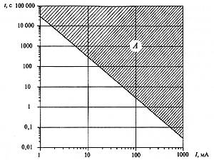 По Дальцилу граница областей допустимых и недопустимых значений тока через человека и длительности его протекания определяется выражением: I = 165 / OT, где I - предельно допустимый ток через человека, мА; T - длительность протекания тока через тело человека, с. Определенные ГОСТ 12.1.038-82 предельно допустимые значения тока через тело человека достаточно точно соответствуют этому выражению. Таблица 1
