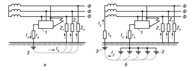 а - в сети с изолированной нейтралью до 1000 в и выше; б - в сети с заземленной нейтралью; 1 - заземленное оборудование; 2 - заземлитель защитного заземления; 3 - заземлитель рабочего заземления; - сопротивление соответственного защитного и рабочего заземления; - ток замыкания на землю В качестве естественных заземлителей используют электропроводящие части строительных и производственных конструкций и коммуникаций. В качестве искусственных заземлителей используют стальные, вертикально заложенные в землю трубы (диаметр 30-60 мм, длина 200-300 см, толщина стенок не менее 3-5 мм); стальные уголки (размеры 6060 мм, длина 250-300 см); стальные прутки (диаметр 10-12 мм, длина до 10 м) или полосы. Толщина полос должна быть не менее 4 мм, а сечение - не менее 48. В качестве заземляющих проводников используют стальные полосы и сталь круглого сечения. Заземляющие проводники соединяют с заземлителями и между собой сваркой, а с корпусами заземляемого оборудования - сваркой или болтами. Заземляемые объекты присоединяют к магистрали заземления параллельно. Каждый корпус электроустановки должен быть присоединен к заземляющей магистрали с помощью отдельного ответвления. Последовательное подключение нескольких заземляемых корпусов оборудования к магистрали заземления запрещено. Сопротивление заземлителей растеканию тока определяется их формой и размерами, а также удельным сопротивлением грунта, зависящим от его вида и влажности. Например, при влажности грунта 10-20% удельное сопротивление () составит: для песка - 700, супеска 300, суглинка 100, глины - 40 и чернозема - 20. На практике для приближенного расчета сопротивления заземлителя (электродов) растеканию тока можно пользоваться упрощенными формулами: для труб RT=0, 9 p/l для полосы Rп = 2, 1 p/l, где l - длина электродов (заземлителей), м. Занулением называется преднамеренное электрическое соединение с нулевым защитным проводником металлических нетоковедущих частей (корпуса электрооборудования, кабельные конструкции и др.), которые могут оказаться под напряжением. Нулевым защитным проводником называется проводник, соединяющий зануляемые части с глухозаземленной нейтральной точкой обмотки источника тока (генератора или трансформатора) или ее эквивалентом. Зануление применяется в трехфазных четырехпроводных сетях напряжением до 1000 В с глухозаземленной нейтралью. При занулении, в случае замыкания сети на корпус электрооборудования, возникает однофазное короткое замыкание, т.е. замыкание между фазным и нулевым проводами. Вследствие этого установка отключается автоматически защитным аппаратом максимальной токовой защиты (перегорают плавкие предохранители или срабатывают автоматические выключатели). Так обеспечивается защита людей от поражения электрическим током. Для быстрого перегорания плавкой вставки предохранителя или отключения автомата необходимо, чтобы ток короткого замыкания, превышал в 1, 5 раза ток отключения автомата, или в 3 раза - номинальный ток плавкой вставки. Таким образом, при занулении исключительно большое значение имеет правильный выбор предохранителей или автоматов в соответствии с величиной тока короткого замыкания петли фаза-нуль. При неправильном выборе плавкой вставки или автомата, когда или плавкая вставка предохранителя может не перегореть или не отключится автомат. Нулевой прово