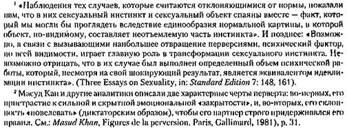 об этом...» И он продолжал оставаться в состоянии «погружения», не будучи когда-либо затронут моими интерпретациями. С самых первых сессий меня поразила лаконичная речь Дидье, что могло рассматриваться мной как знак того, что лечение было невозможно. Я чувствовала, однако, что экономность его дискурса превосходно соответствовала человеку, который жаловался на столь огромное страдание. Он говорил о своем страдании, сообщая мне по секрету различные «рассказы» в «оперативной» и «технической» манере, характерной для людей, пораженных психосоматическими заболеваниями. Он избавлялся от этих рассказов, как если бы они были неодушевленными предметами или бесполезными пищевыми отходами. Дидье описывал себя как одинокого, неспособного любить, нейтрального, отчужденного от своих коллег и своей жены, даже индифферентного к смерти своей матери. Лишь мастурбация и писание картин могли поддерживать его интерес. Будучи рожден вслед за сестрой, Дидье обожался матерью, которая одевала его как девочку и стригла под девочку, пока он не пошел в школу. Она властвовала в жизни маленького сына, делая его средством осуществления своего инвертированного желания, ибо превращая сына в дочь, она могла любить себя в образе маленькой девочки. Дидье говорил не «моя» мама или «наша» мама, а «La mere». Мне предстояло понять, что определенный артикль был частью защитной системы — первертной комбинаторики Дидье, — которая могла защитить его от подавляемой, возбуждающей и опустошающей близости, которую он разделял со «своей» матерью. Я использую термин первертная комбинаторика из-за его исключительно мастурбационной сексуальной деятельности, соответствующей соматическим симптомам и сублимациям (его картин). Это поддерживало его дискурс на абстрактном уровне (La mere) и сохраняло его личность в чудесной изоляции. Если «La mere» не является кем-то определенным, тогда нет никого.