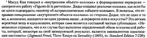 Попытка Дидье определить себя как мужчину потребовала от него смотреть в лицо эдипову соперничеству с отцом. До этой эдиповой ярости ее отрицание порождало фантазию тотального сексуального переживания. Сексуализация стала исподволь внушать отцовскую угрозу кастрации, что заставило Дидье довести отца до смерти. Я убеждена, однако, что эдипова вина (к аналитику, предположительно осуждающему «тотальное наслаждение», которого желал, воображал себе и предлагал аналитику ее пациент) принимала участие в многочисленных случаях менее серьезных расстройств, которым был подвержен Дидье. Сколь бы незначительным ни было подобное недомогание, оно крайне беспокоило Дидье, так как ему уже ранее советовали подвергнуться хирургической операции. Соматические симптомы Дидье свидетельствовали о том, что психическая репрезентация может иметь место и без достижения полного контроля над противоречивыми влечениями. Каким образом первертная экономика данного пациента была ответственна за соматическое разрешение Эдипова комплекса? Подвергая себя такому «наказанию», не желал ли Дидье наказать меня, женщину и аналитика — потому что он был неспособен разрешить свои сексуальные конфликты без вмешательства маскулинной третьей стороны? Даже если это было так, я продолжала считать, что кардинальное вмешательство хирурга было намеренно выбрано в физиологической регистрации отыгрывания, даже «коллажа» и «де-коллажа». В этом смысле, оно несло свидетельство несократимой и недоступной эротической близости перверта. С другой стороны, говоря об этих событиях внутри переноса, пациент сохранял привилегированное место для лечения: место для воображаемого и символического, место, где могла быть разыграна драма процесса его индивидуации.