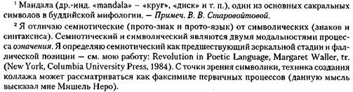 В конце лечения Дидье вручил мне мой портрет. Это был не коллаж, а картина, написанная им по фотографии, на которой я держала сигарету. На данном портрете, однако, мои пальцы ничего не держали. Все символы из первого сновидения могут быть найдены на этом портрете. Тем не менее, каждый элемент был выражен особым образом — как ироническая улыбка, рука индийской статуи, круг мандалы1. Женщина-иностранка, воссозданная в зеркальном отражении, без вины или неуверенности, пристальный взгляд, не вызывающий каких-либо опасений, и присутствие небытия. «Ничего не держат пальцы, никакого пениса, никакого фетиша. Не правда ли, я хорошо постарался», — сказал он, «понимающе» улыбаясь, хотя он уже ранее стал свободнее и более динамичным. Мы начали с защитной идеализации аналитика. Затем мы занялись обсуждением семиотических выработок2, то есть тех коллажей, которые могли рассматриваться как факсимиле первичных процессов и представлений вещей,