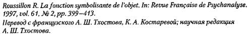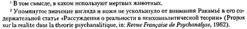 Вытеснение, «отсылающее обратно» в бессознательное вторичные фантазмы, стало бы тем, что Фройд называет «вторичным вытеснением» или «вытеснением в последействии», Созданию или записи, фиксированию у индивида первофантазмов соответствует другой тип «вытеснения», более тесный и мифический, который Фройд называет «первовытеснение, первоначальное вытеснение» (Urverdangung). Мы попытаемся далее развить эти подходы. См. также: J. Laplanche, S. Leclaire, L’Incjnscien. Une Etude psychanalitique, in: Les temps moderns, Juillet1961. 56. Среди них необходимо выделить покровные воспоминания и инфантильные сексуальные теории. 57. Для Фройда подобные особенности покровного воспоминания подтверждают, что 58. Фройд 3. Бессознательное. 1915. 59. Фройд 3. Из истории одного детского невроза. 1919. 60. Для С. Айзекс (S. Isaacs) «первичные фантазмы (phantasmes) связаны с психическими процессами, очень далекими от слов». И только для того, чтобы «иметь возможность о них говорить», мы выражаем их в речи, но вводим тогда «чуждый элемент». Айзекс, пользуясь выражением Фройда, говорит о «языке влечения»; и очевидно, что не его характер, вербальный или невербальный определяет порядок языка. Но если она смешивает язык и возможность экспрессии, тогда, может быть, она плохо представляет себе изначально заложенное во взглядах Мелани Кляйн: ее стремление уловить язык, который не был бы словами, но тем не менее был бы структурирован согласно парам противоположностей (хороший-плохой, внутренний-внешний). Смелость техники Мелани Кляйн, похоже, предполагает обращение не к непосредственному выражению жизни влечений, а к неким фундаментальным означающим. Айзекс С. Природа и функция фантазии. S. Isaacs, Nature et function du phantasme, in: Developpment de la psychanalyse. Paris, PUF, рр. 80-85. 61. См. разные варианты формулировок С. Айзекс: «я хочу ее целиком проглотить», «я хочу сохранить ее в себе», «я хочу разорвать ее па кусочки», «я хочу ее выбросить наружу», «я хочу ее снова вернуть, мне надо сейчас ее иметь», и т. д. (Сьюзен Айзекс. Природа и функция фантазии.. S. Isaacs, Nature et function du phantasme, in: Developpment de la psychanalyse. Paris, PUF, р. 81). 62. Фройд 3. Три очерка теории сексуальности. 1905. 63. Конечно, мастурбация чаще всего предполагает воображаемое отношение с объектом; это означало бы давать чисто внешнее определение ее как аутоэротической, поскольку субъект достигает удовлетворения только от собственного тела. Но детская аутоэротическая активность, например сосание пальца, совсем не предполагает отсутствие какого-либо объекта. То, что в первую очередь определяет ее как аутоэротическую, это, как мы будем отмечать далее, особый способ удовлетворения, специфический для «рождения» сексуальности и оставляющий какой-то след в подростковой мастурбации. 64. Похоже, «первый раз желать» (Wunschen) было галлюцинаторным инвестированием воспоминания об удовлетворении». (Фройд 3. Толкование сновидений. 1900). 65. См., например, толкование Фройдовской гипотезы первичной галлюцинации у С. Айзекс: «Представляется возможным, что галлюцинация лучше выполняет свою функцию в те периоды, когда инстинктивное напряжение еще слабо выражено, например, когда младенец наполовину проснулся и только еще начинает испытывать голод (...). Затем страдание от фрустрации пробуждает все возрастающее желание, например, переживание, связанное с инкорпорацией всей груди, с тем чтобы сохранить ос как источник удовлетворения; и свою очередь, это ж
