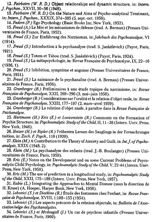 видно: как было сказано, нет суперпозиции между пре-эдиповым и эдиповым развитием, с одной стороны, и пре-генитальным и генитальным — с другой [36]. 2. Несмотря на разногласия и совпадения в результатах исследовании психоаналитиков, работающих с детьми, взрослыми, и генетических психоаналитиков, следующие гипотезы имеют актуальность. А. Для прямого наблюдения понимание генезиса целостного объекта через пре-объект и парциальный объект является возможным. Но последовательность оральной и анальной стадий не является очевидной. На пре-объектной стадии нет оральной зоны, а скорее, предварительная организация Я, которую Щпиц определил как «примитивную полость». Первый организатор переводит отношение в пре-гештальт, где рот пре-объекта включен в более сложный комплекс. В недавних работах Боулби, несмотря на критическое отношение к ним, остается бесспорным, что этологическая отсылка предлагает нам достаточно расширенную точку зрения на сферу чисто оральных интересов. Б. Фантазмы отношений парциального объекта реконструируют нарциссический и пре-объектный опыт, переработанный впоследствии. Критика Фэрберном классической концепции стадий справедливо оценила важность эрогенных зон, подчеркнутую Фройдом. Можно лишь констатировать существование этих фантазмов, но нельзя их понять, следуя за М. Кляйн, забывающей об отношениях в угоду инстинктным конфликтам. Парциальный объект предполагает одновременно инкорпорацию и отвержение, иными словами, инвестицию оральной и анальной зон. Таким образом, фантазм парциального объекта действительно соответствует периоду, когда М. Кляйн проводила так называемое раннее психоаналитическое лечение в направлении к трехлетнему возрасту, и где эрогенность анальной зоны не подлежит сомнению. В. Психоаналитики, работающие со взрослыми, находят в неврозах и психозах, которые они лечат, генитальный, анальный и оральный материал, часто, но не всегда стратифицируемый. Речь идет о нео-организациях, которые возникают одновременно из деструктурирования и реструктурирования, что, по общепринятому мнению, называют регрессией. Но нужно подчеркнуть, что «конфликтуализация» каждого этапа фиксации — это клинический факт. Например, анальный материал зачастую может быть понятым только в свете страха генитальной кастрации. А так часто встречающееся богатство орального материала указывает на господство анального объекта: за оро-генитальной непрерывностью нужно уметь обнаружить анальный материал. 3. В генетической теории объектных отношений обычно обращаются к непсихоаналитическим концепциям среды, коммуникации, этологии, которые мы использовали в этой работе. Здесь есть опасность приблизительности и эклектики, которую нельзя недооценивать. Стремление к интеграции должно избегать поверхностных обобщений, приемлемых для гипотез общего плана. Многие психоаналитики остерегаются интегрировать специфический психоаналитический материал, принадлежащий к экспериментальному полю общих гипотез, относящихся к более широкому операционному и гетерогенному сектору. Обращение к этим теориям, о чем уже было сказано, рискует обесценить энергетическую гипотезу, которая является фундаментом психоанализа. Поверхностное чтение сложных текстов Хартманна, Криса и Левенштайна и описаний автономного Я, начиная 