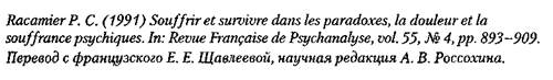 неразрешенных дилемм; будь то иррациональная передача непроработанного траура; будь то раннее нарциссическое и сексуальное соблазнение; во всех этих невидимых случаях и во множестве других, Я, находящееся в процессе формирования, ввергается в состояние страдания. Тогда как сам процесс его нарциссической подпитки и его примыкания дает сбои, Я перегружается еще и невыполнимыми задачам и. Ни вытеснение, ни амбивалентность, ни даже расщепление, что входит в ранний «инструментарий» Я, не способны противостоять таким требованиям (Racamier, 1991). Способность Я оказывается превышенной (мы называем «способностью Я» пространство, занимаемое Я, и бремя того, что оно способно «переработать»), Душа оказывается заполненной тем, что Ф. Тюстэн назвал «черной дырой». Она находится в состоянии страдания. Я употребляю понятие страдания Я в значении, близком к тому, когда говорят о муках организма. Это органическое страдание может оставаться диффузным, глобальным, немым; скорее, можно было бы думать о некоей нехватке жизни, чем об излишке мучений. Организм страдает, когда он поставлен перед задачей, которую не может разрешить теми средствами, что имеются в его распоряжении; ему не хватает глюкозы, эритроцитов, кислорода; он переполнен ядами, мочевиной, молочной кислотой и т. д. Возможно, он и получил слишком много ран, но доминирующим является всеохватывающее страдание. Становится очевидным, что тайные раны Я, скрытые страдания души взывают к предельному вниманию не только клиницистов и терапевтов (именно этой задаче, в частности, уже посвятил себя, и очень своевременно, Ж. Бегуэн (1979, 1990)), но и исследователей-теоретиков.