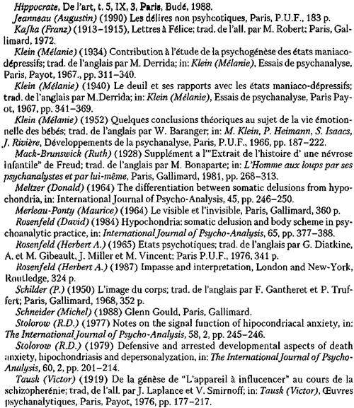 Через бисексуальность и двухфазность работа ипохондрии участвует в процессе символизации тела и мира в психике. Тело — необходимое условие и источник психической реальности — в то же время относится к внешнему миру (К. Angelergues, 1988) и становится в данном случае привилегированным местом для определения отношений между субъектом и объектом, а также между различными психическими инстанциями. Ипохондрическое самонаблюдение врастает в подобную «кваэирефлексию» тела в том виде, как она описана у Мерло-Понти (1964), сохраняющую промежуток между чувствующим телом и воспринимаемым телом, который не всегда остается незаполненным (р. 326). Если эта работа ипохондрии проявляется в патологических выражениях, близких к психозу, то можно также увидеть важность необходимого гиперинвестирования тела в психику, для того чтобы сделать возможным распознавание изменений объекта в имеющем половые признаки теле.